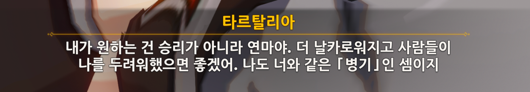 .........타르탈리아를 처음 접하면 설정 과다에 캐릭터성이 뒤죽박죽인 것처럼 보입니다. 활을 가장 못 다루면서 무기로 사용하질 않나, 냉혹한 집행관이지만 자기 가족을 매우 아끼고, 전투광이면서 묘하게 침착하고, 양심은 없는 거 같은데 의리는 있고, 체계를 싫어하고 제멋대로인 것 같으면서도 위에서 까라면 까고, 앳된 인상인데 몸은 잘 훈련된 전사라는 점 등등 서로 모순적인 요소로 가득 차 있죠.